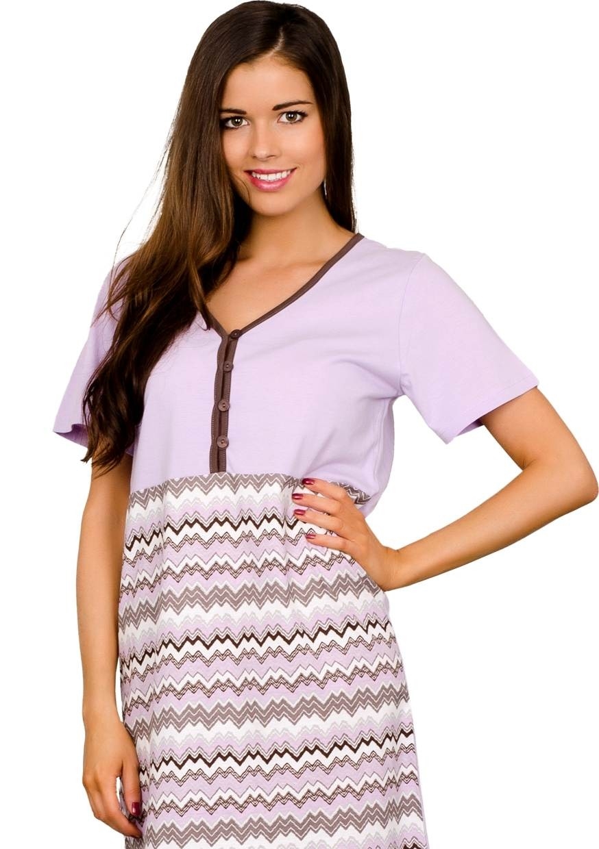 Dámská propínací noční košile s krátkým rukávem. Jednobarevný podklad bavlněné košile je doplněný barevným cik-cak vzorem. Výstřih a zapínání košile zbobí jednobarevný lem.