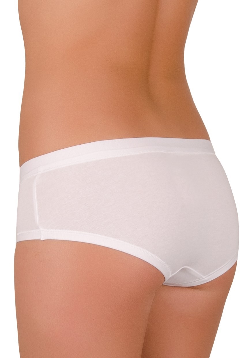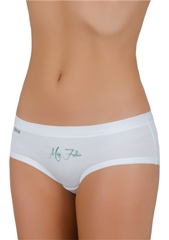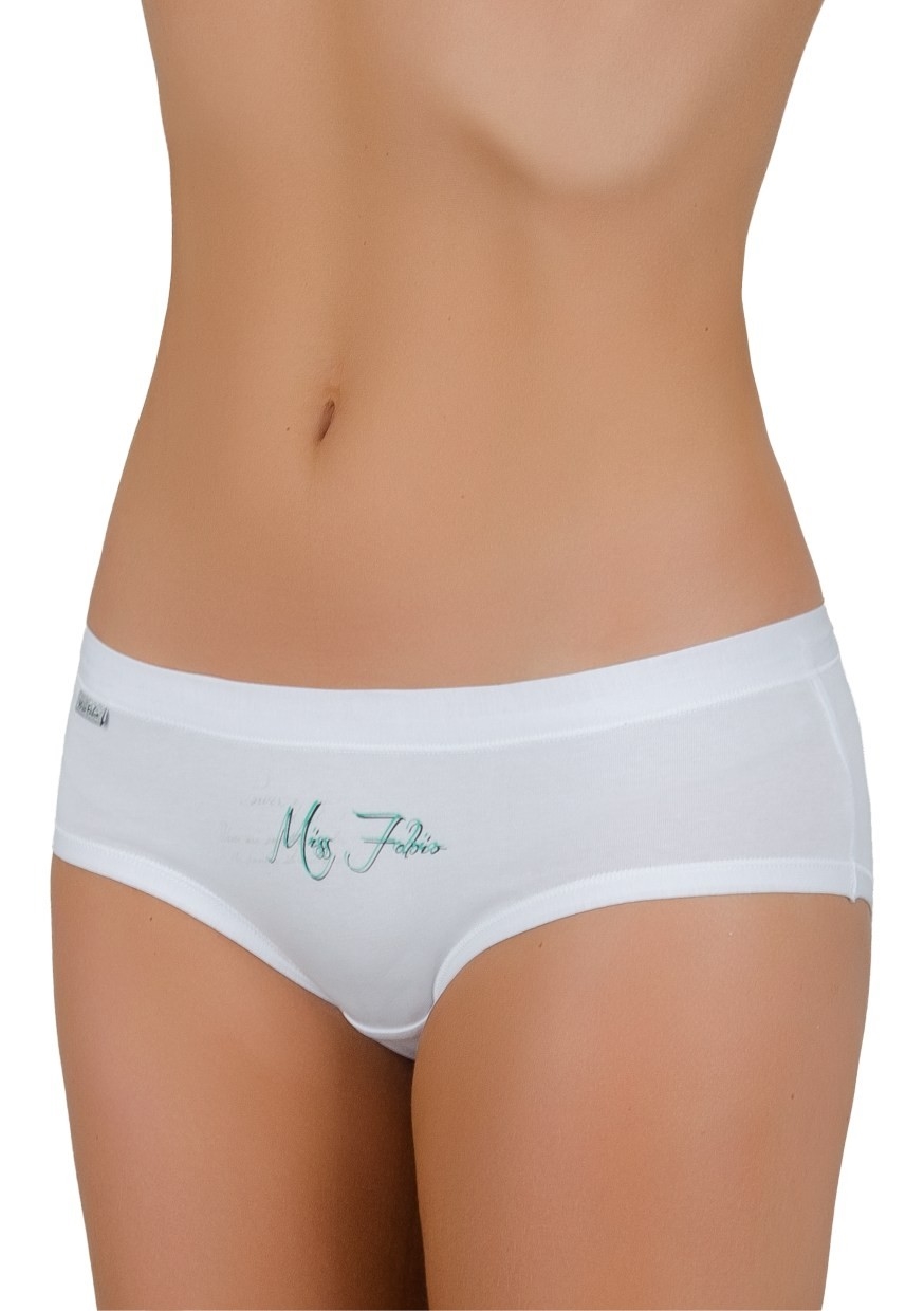 Dámské bavlněné francouzské kalhotky s širokým elastickým lemem v pase a nápisem Miss Fabio vpředu. Vnitřní část rozkroku kalhotek je podšita bavlněnou látkou.