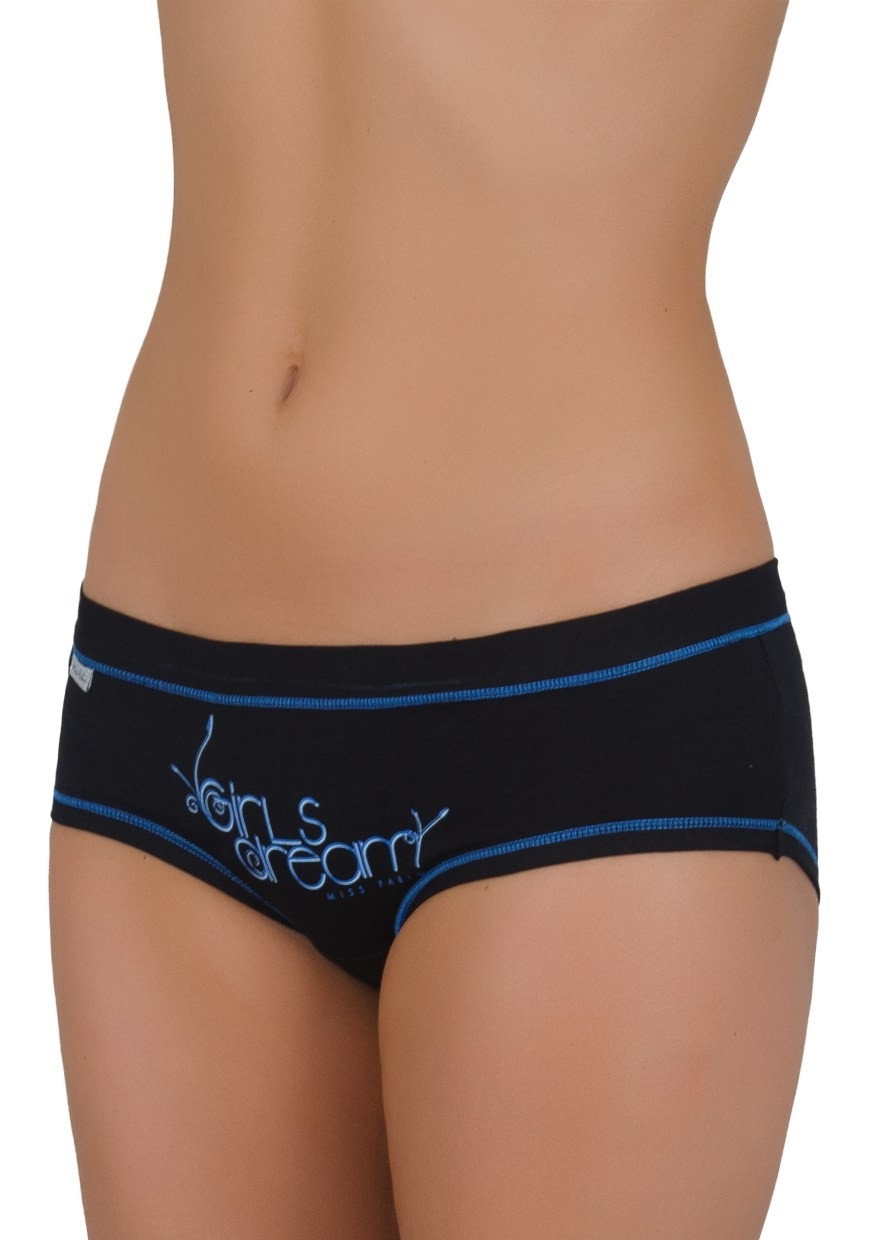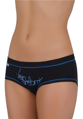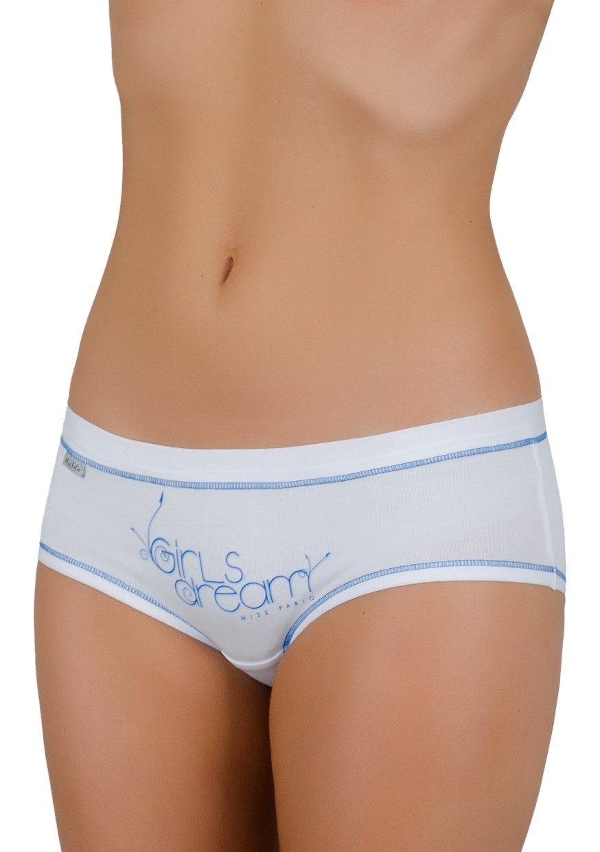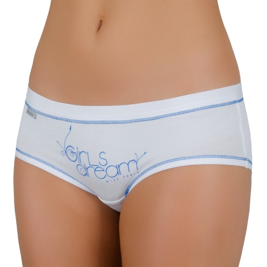 Dámské bavlněné francouzské kalhotky s širokým elastickým lemem v pase a nápisem Girls dream vpředu. Vnitřní část rozkroku kalhotek je podšita bavlněnou látkou.