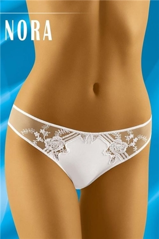 Jemné dámské kalhotky Nora Wolbar vyrobené z elastického materiálu. Bok kalhotek je z průsvitného tylu, který je ozdobený jemnou výšivkou. Střih kalhotek se dokonale přizpůsobí tělu a podtrhne jeho krásu.