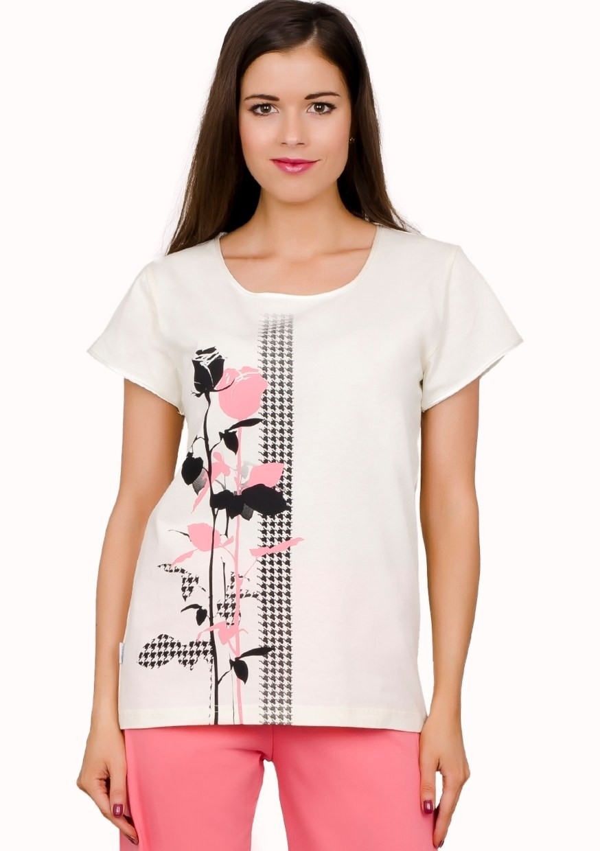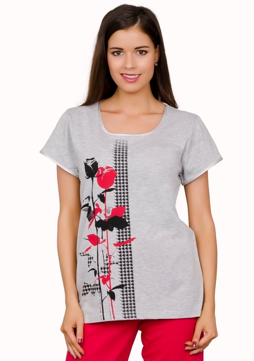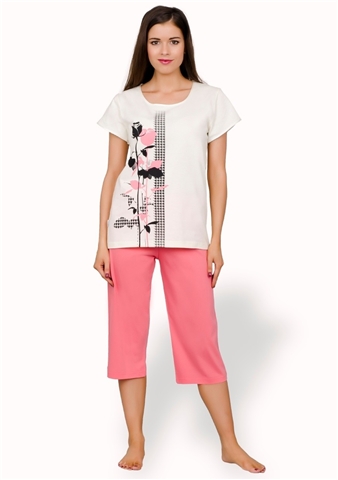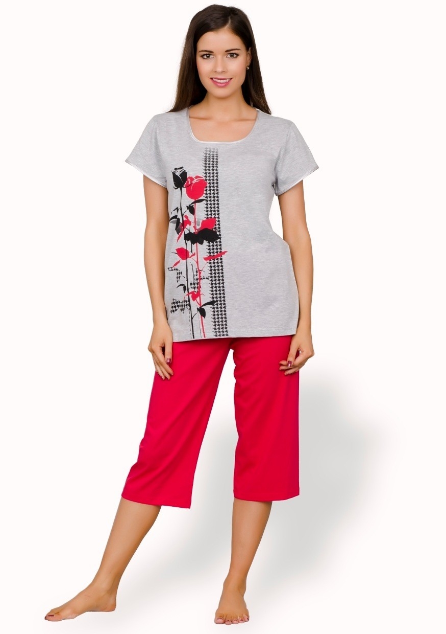 Dámské bavlněné pyžamo má tričko s krátkým rukávem a capri kalhoty. Jednobarevné tričko zdobí obrázek růží. Jednobarevné capri kalhoty jsou šité bez kapes a mají volnou gumu v pase. Možno použít i jako domácí oblek.