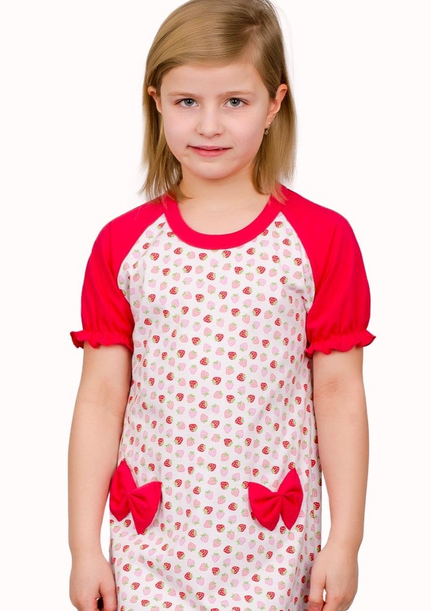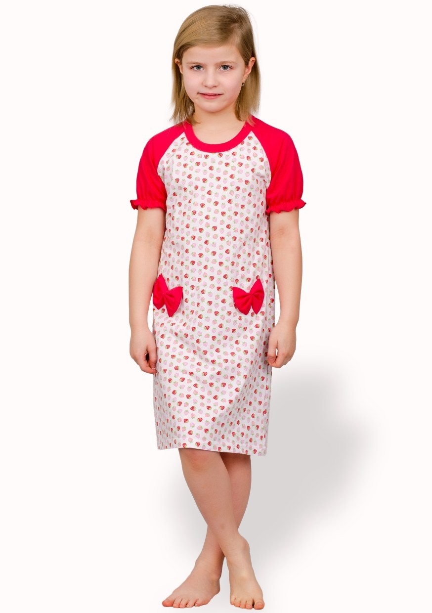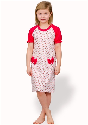 Dětská noční košile s krátkými řasenými rukávy. Bavlněnou košili se vzorem jahod zdobí na bocích dvě mašle.