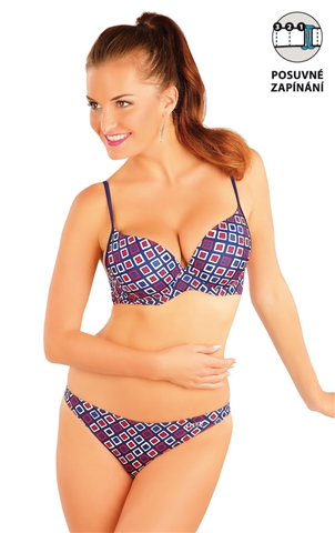 Podprsenka s košíčky. Zapínání na háček s třístupňovou regulací. Nastavitelná ramínka. Chloruodolný materiál. 80% Polyamid + 20% Elastan/ Lycra Xtra Life Tisk. 36, 38, 40, 42, 44