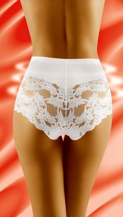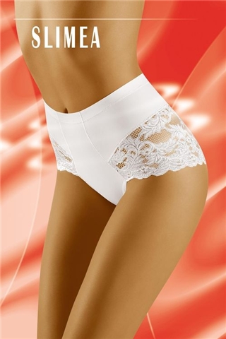Dámské stahovací kalhotky Slimea Wolbar vyššího střihu s plochými švy, díky kterým jsou ideální pod oblečení. Na bocích a v zadní části jsou zdobené krajkou s květinovým motivem. Velmi silně stahují boky a břicho.